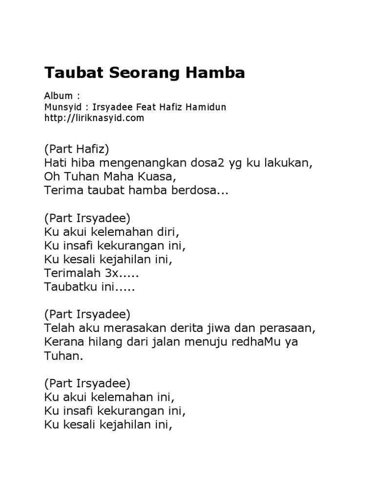 Lirik Lagu Taubat Seorang Hamba- Hafiz Hamidun ft Irsyadee Hati hiba mengenangkan Dosa-dosa yang ku lakukan Oh Tuhan Maha Kuasa Terima taubat hamba berdosa Ku akui kelemahan diri Ku insafi kekurangan ini ku kesali kejahilan ini terimalah3x taubat ku ini Telah aku merasakan. Taubat Seorang Hamba Key DmDm Taubat Seorang Hamba Key EmEm. Lirik Lagu Taubat Seorang Hamba Hafiz Hati hiba mengenangkan Dosa-dosa yang ku lakukan Oh Tuhan Maha Kuasa Terima taubat hamba berdosa Irsyadee Ku akui kelemahan diri Ku insafi kekurangan ini Ku kesali kejahilan ini Terimalah terimalah terimalah taubatku ini Irsyadee Telah aku merasakan Derita jiwa dan perasaan Kerna hilang dari jalan.